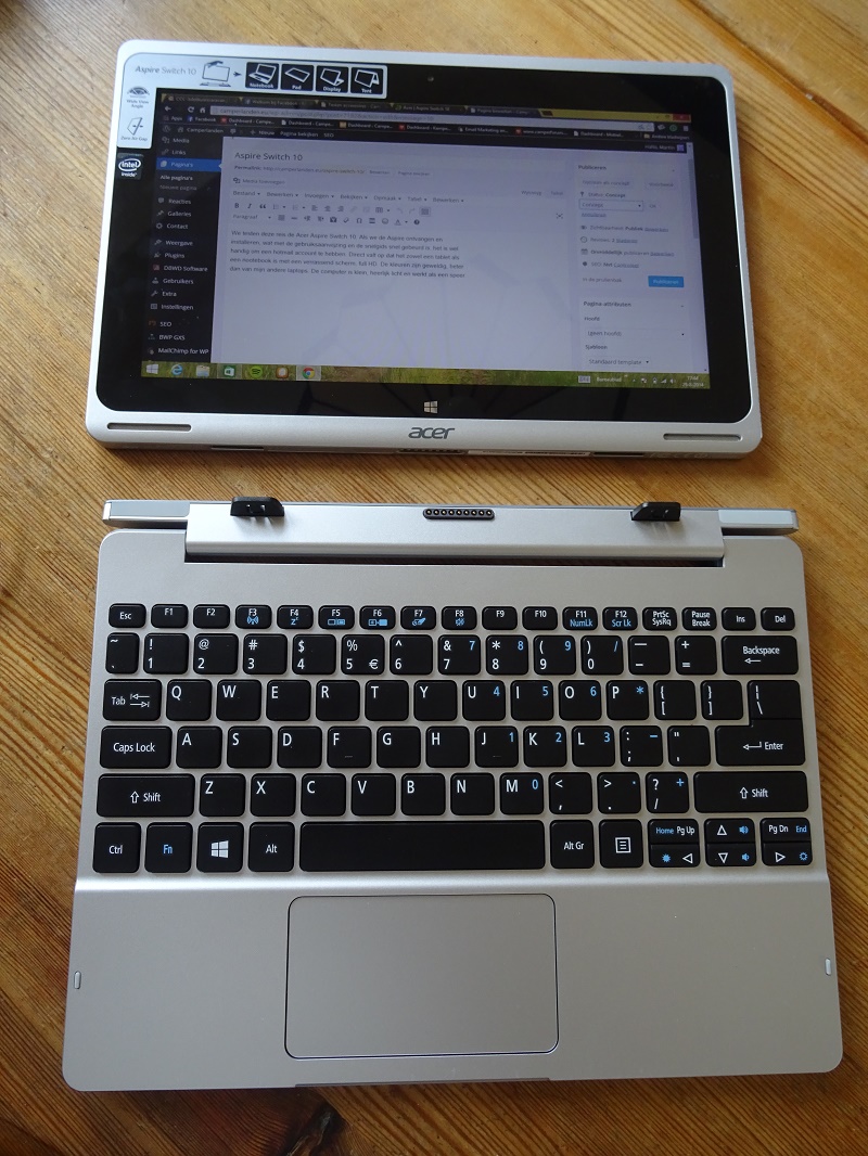 Ik gebruik de Aspire Switsch 10 hem dagelijk voor de websites, om foto’s aan te passen voor het gebruik op de websites. De Aspire is erg handig voor gebruik onderweg. Dus niet alleen in een camper, maar voor iedereen die reist. Ook neem je hem makkelijk mee als je in een restaurant of iets dergelijks wil internetten. Ook buiten is het scherm voldoende goed te lezen.