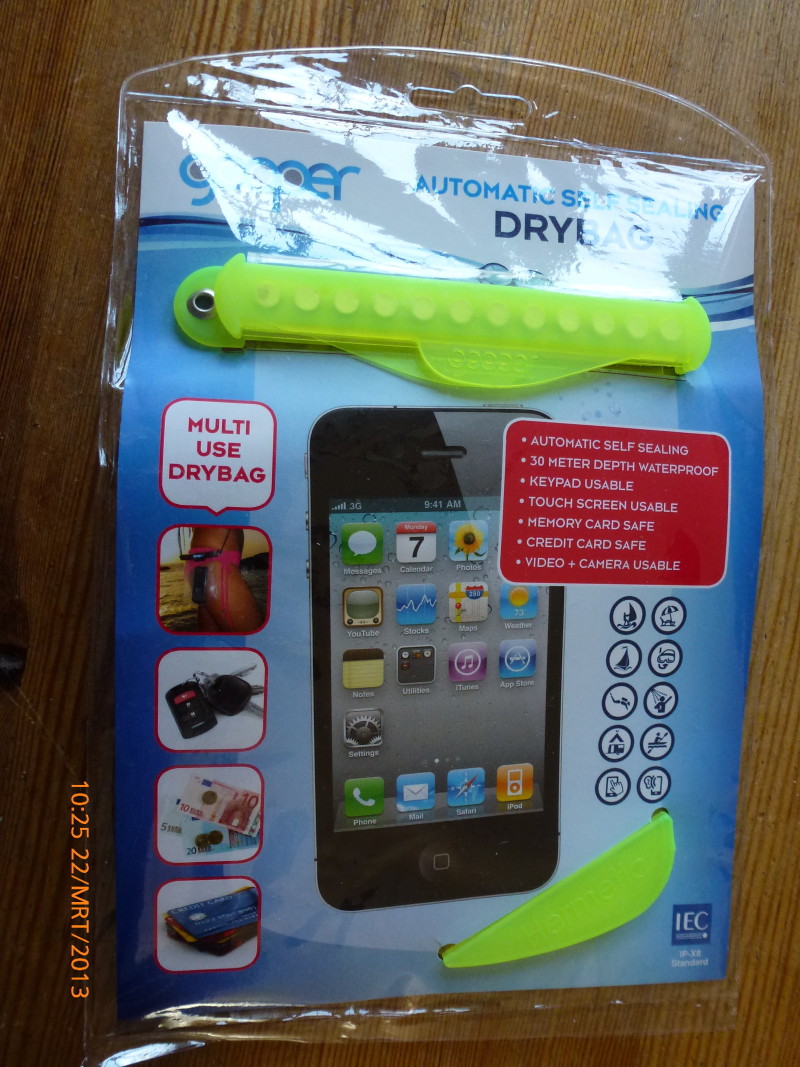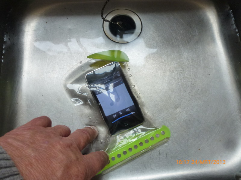 En Natuurlijk proberen we ook direct of een I-pod ook het echt waterproof wordt opgeborgen en bediend kan worden. Ook dat werkt prima en alles blijft keurig droog. Op de foto ziet u mijn smartphone in de afwasbak.