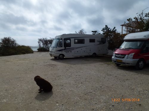 Een Duitse camperraar die voor ons staat is boos, hij vind dat we te dicht op hem staan. Maar aan de andere kant staat een boom en een tussenruimte waar zeker nog een camper tussen kan vinden wij ruim voldoende. Een poosje later gaat er nog een camper naast ons staan, nu wordt de ruimte wel erg klein, maar met deze wind logisch dat iedereen uit de wind wil staan. Wel zet hij zijn camper met de deur naar ons, hem vriendelijk verzocht toch andersom te gaan staan. Hij doet dat.