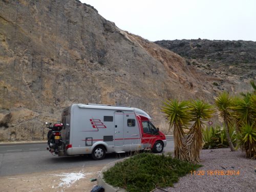 14 februari rijden we verder en vinden een mooi plaatsje in Roquetas de Mar (W36.719257 en W -2.630850 / 36°43’09” W 2°37’51”). We staan direct aan zee. We zijn op dit moment de enige Nederlanders hier. Omdat vrienden van ons een parkeerplaats verder stonden met meer Nederlanders zijn we daarheen gereden. We konden op de gehandicaptenparkeerplaats staan. Direct begon een Duitse vrouw tegen de buurman te vertellen dat ik wel een hele hoge bekeuring zou krijgen en dat ik asociaal was. Haar gevraagd even te kijken naar mijn voorruit en of ze onze handicaps wilde hebben. Iets later kwam haar man dat we wel dicht langs de plaats stonden waar fietsers langs kwamen. En dan sta je keuring in het parkeervak. Mensen die heel lang op een plaats staan gaan zich als eigenaars gedragen. Erg irritant.