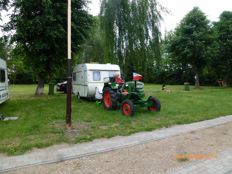 Of we nog naar Berlijn gaan is de vraag, het is heerlijk weer, maar te warm om Bo in de camper te laten. Dus als het dit weer blijft passen we onze plannen aan. In Magdeburg is overigens een sanizuil met alle voorzieningen. We verbazen ons iedere keer weer dat camperraars teiltjes afwaswater e.d. buiten gooien of een camper geen vuilwatertank heeft. De 22ste was de scooterband binnen en werd ik met voorrang behandeld, zodat we halverwege de middag weer een nieuwe achterband op de scooter hadden voor de som van € 96,50. Deze pech was dan verholpen, s ’avonds bleek dat we een hoop tv kanalen niet meer hadden. We kregen op alle Nederlandse zenders “geen rechten” te zien. Ja, pech komt kennelijk nooit alleen want ook mijn tegoed op de internetkaart was op. Dus maar even zonder internet, want 1 dezer dagen willen we Polen binnentrekken. Dan zien we daar wel weer internet te krijgen.
