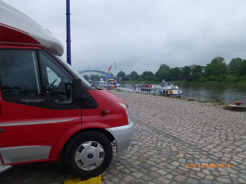 We zijn naar Minden gereden Reisemobielstellplatz Kanziers Weide (N52,28750 en O 8,9251). Even met de scooter naar het centrum gereden, als je goed te voet bent kan dat ook prima via de loopbrug. Het weer is droog, maar wel bewolkt. In een restaurantje Doner Kebab gegeten. Er stond een feesttent die druk door de jeugd bezocht werd, natuurlijk hoorden we de muziek, maar geen enkele overlast toen de jeugd in de nacht vertrok. Hier kan de Nederlandse jeugd een voorbeeld aan nemen. Gisteren zagen we op de televisie dat Bosnië, Kroatië en nog wat oosterlijk gelegen landen erg veel wateroverlast hebben. Ook in Praag schijnt erg veel water gevallen te zijn dat de stad blank heeft gezet.. Wij zullen de route dus aanpassen want een waadpak heb ik niet bij me :-). Mogelijk blijven we in Duitsland, we willen in ieder geval nog een keer naar Berlijn.